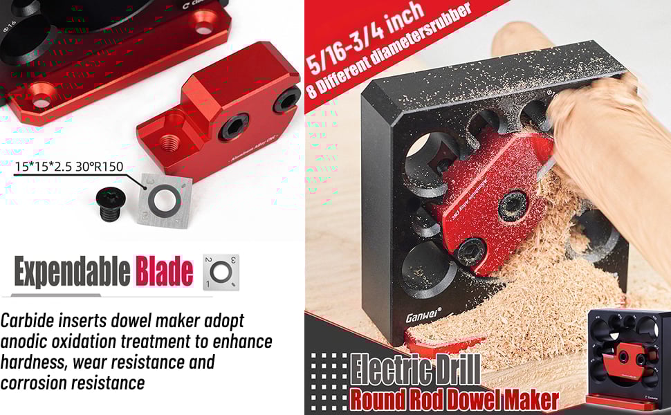 Easy to Operate : The dowel making jig with carbide inserts is easy to operate. Simply loosen the screw and rotate the red blade holder to the desired diameter. Retighten the screw and start making. The included blades are also interchangeable.